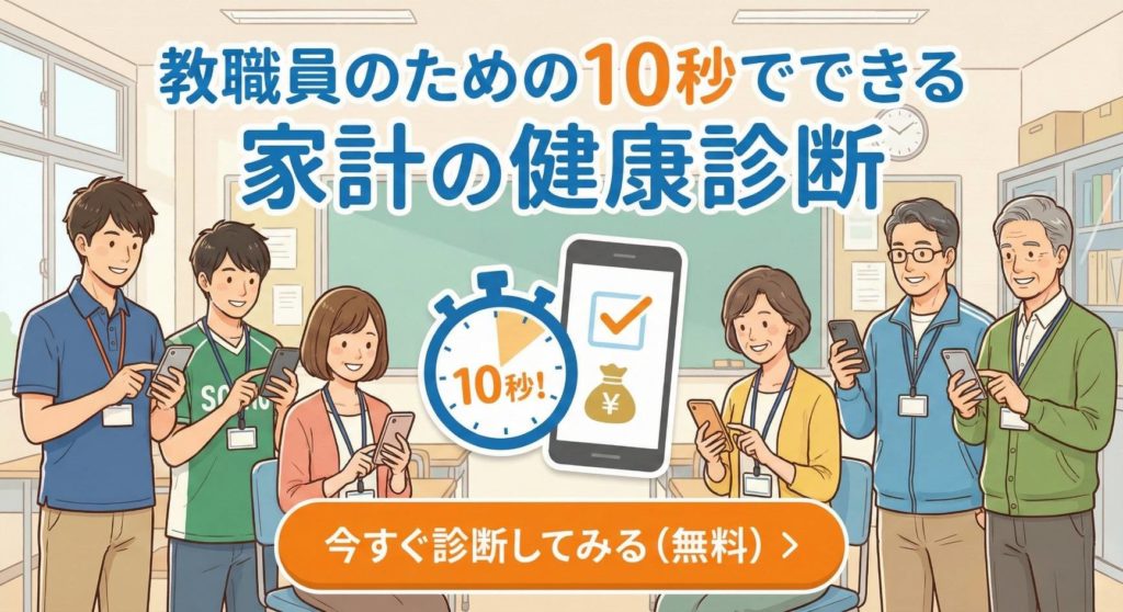 2026.01.09 マネー 公務員向け教員向け 教職員専用10秒でできる家計の健康診断 教職員専用 10秒でできる家計の健康診断 無料チェックシート形式で、いまの状況をサクッと整理します Q1 / 3 現在のキャリアの状況は? A: 若手(20代〜30代前半) B: 中堅(30代後半〜40代) C: ベテラン・定年前(50代〜) Q2 / 3 職員室では言いにくい「お金の悩み」は? A: 忙しすぎて何も考えられていない B: 周囲の投資話に焦っている C: 定年後の生活レベル維持が不安 ← 戻る Q3 / 3 資産形成に対するイメージは? A: なんとなく怖くて始められない B: 興味はあるが、勉強する時間がない C: すでに始めているが、正解かわからない ← 戻る LINEで健康診断の続きを受け取る あなたにおすすめの整理術 もう一度診断する 本診断は一般的な情報提供であり、投資助言ではありません。 Follow Me フェイスブックでフォローする インスタグラムでフォローする 教職員の不動産売却 1分整理チ...記事一覧